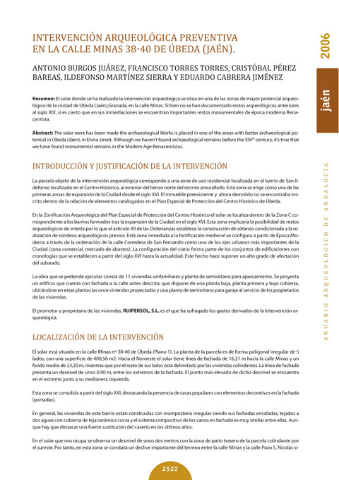 Calle Minas 38-40 de Úbeda - Informe de la intervención arqueológica / Anuario Arq. de Andalucía 2006