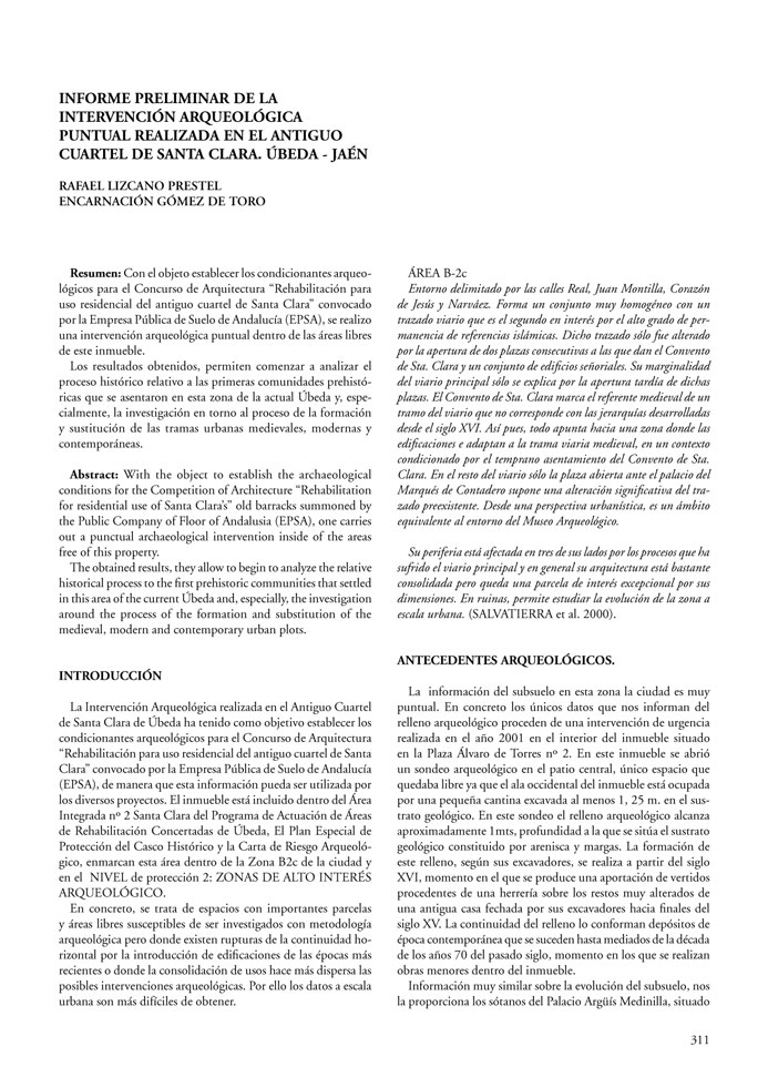Cuartel de Santa Clara de Úbeda - Memoria preliminar de la intervención arqueológica preventiva en Plaza de Santa Clara nº 2-3, Úbeda / Anuario Arq. de Andalucía 2010